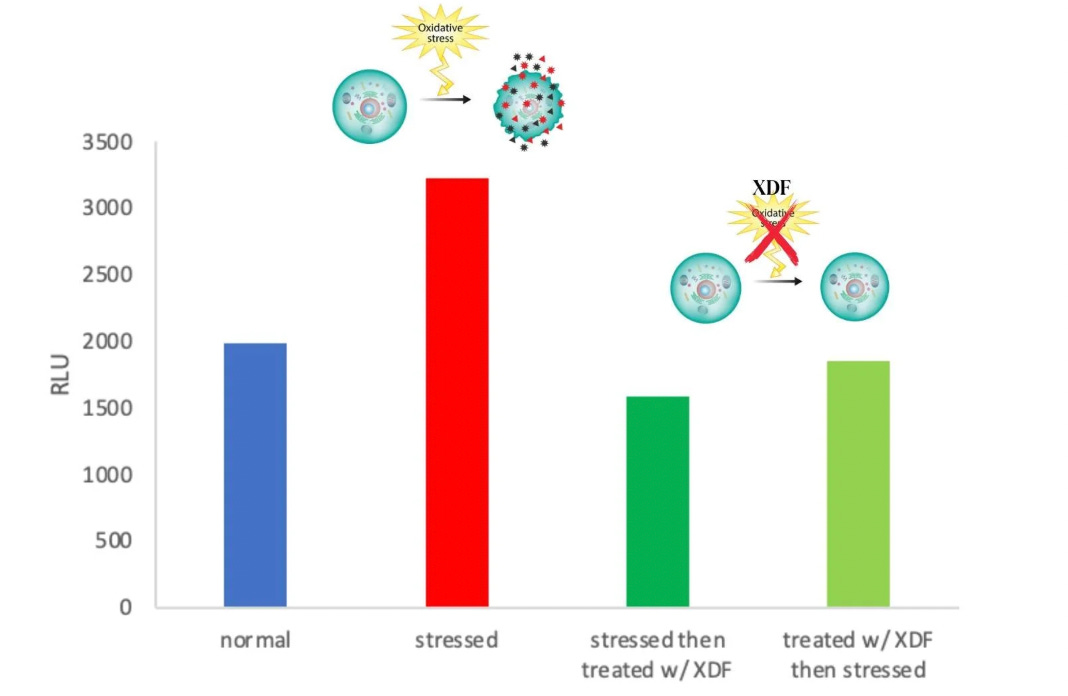 The figure above highlights the efficacy of XDF, delivering EGCG and quercetin, in mitigating the effects of oxidative stress on skin cells. When exposed to oxidative stress followed by XDF application, the skin cells returned to a state comparable to unstressed cells (dark green bar). Similarly, when XDF was applied preemptively, followed by oxidative stress induction, no significant change was observed, with the cells maintaining a state resembling unstressed cells (light green bar).