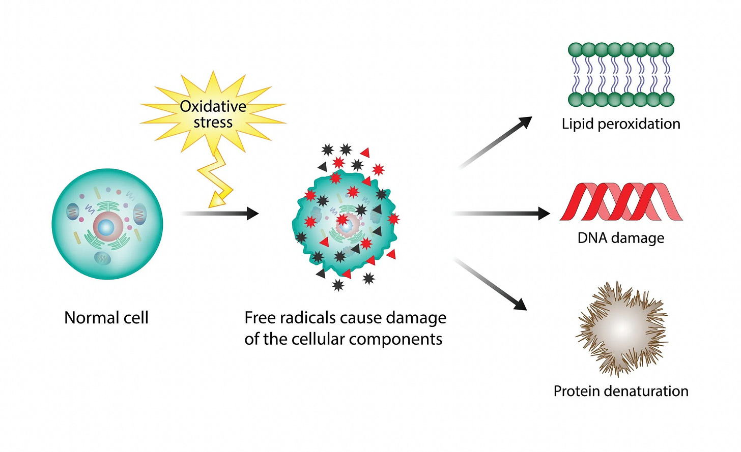 Free radicals are produced naturally during cellular metabolism, particularly in the mitochondria. These molecules are highly reactive and unstable. Under normal conditions, your body manages them with antioxidant enzymes (for example, superoxide dismutase and glutathione peroxidase). However, UV exposure, pollution, emotional stress, and even diet can tip the balance toward excess ROS leading to: