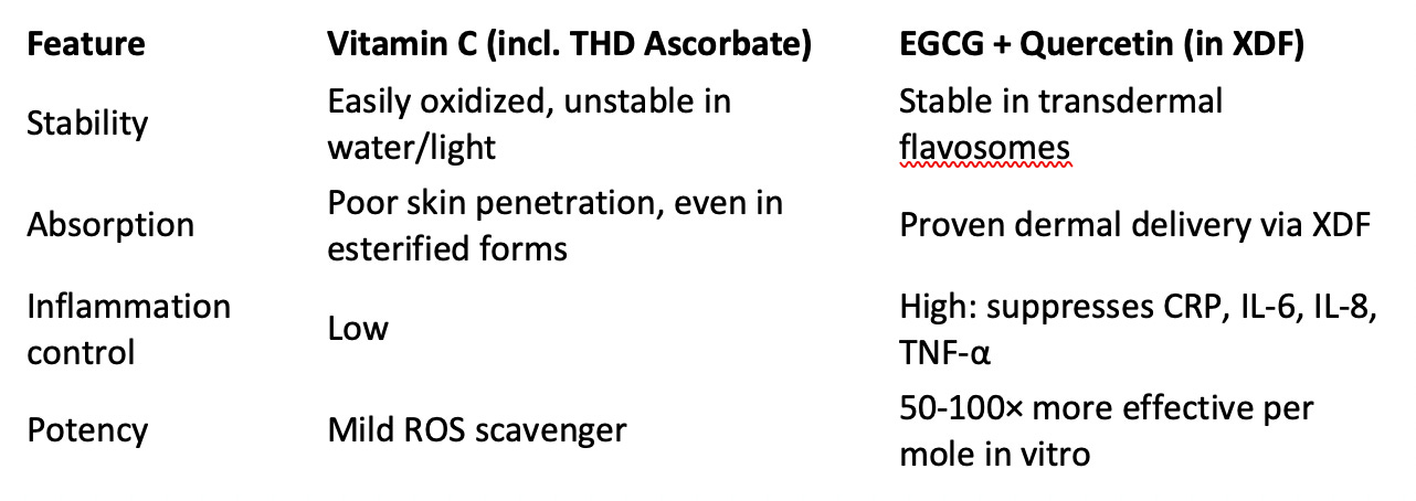 Vitamin C works primarily by scavenging free radicals on the surface. EGCG and quercetin, when delivered properly, penetrate deeper, intercept upstream oxidative pathways, and directly reduce inflammatory signaling inside the skin.