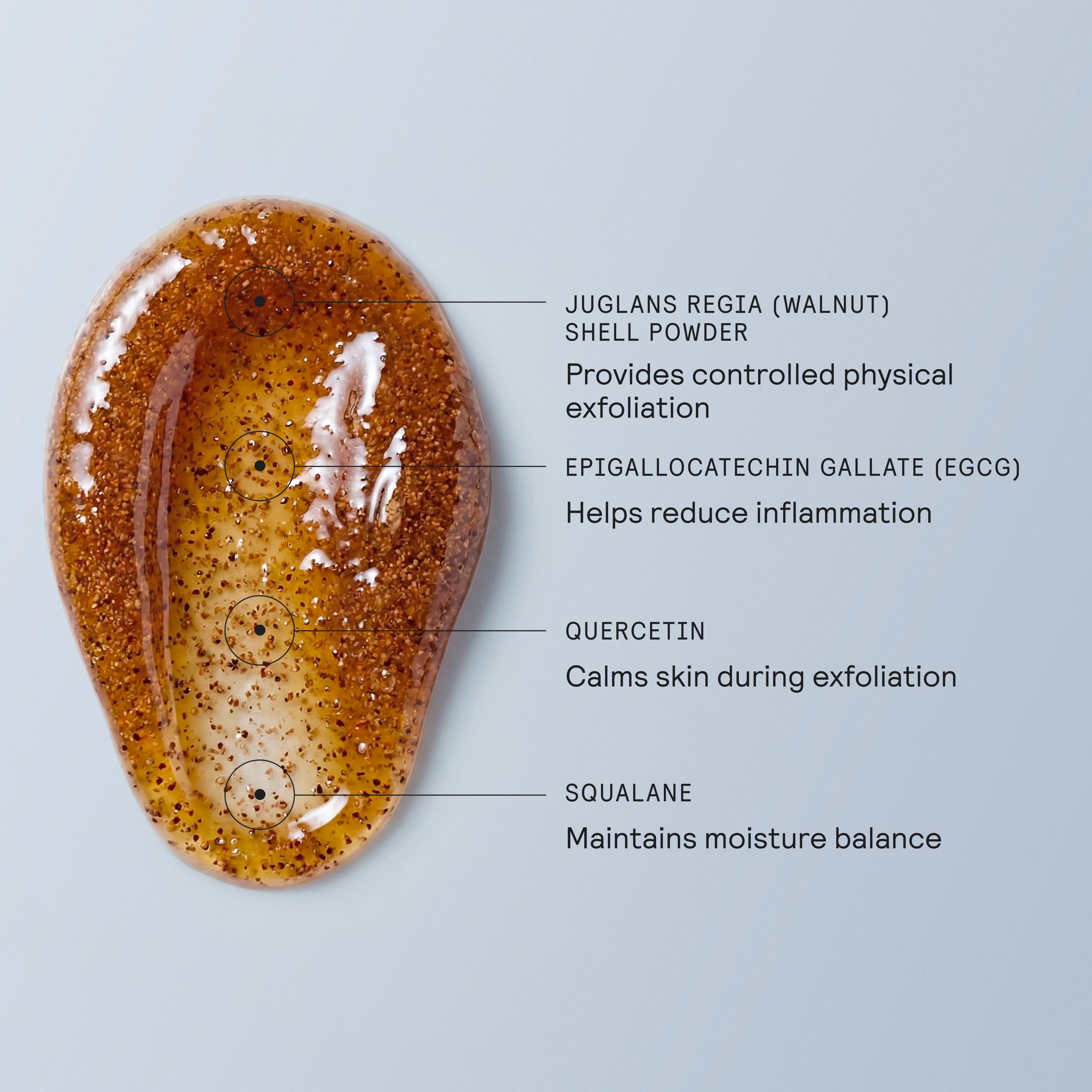 Full Ingredients List: Water (Aqua), Cocamidopropyl Betaine, Glycerin, Juglans Regia (Walnut) Shell Powder, PEG-40 Hydrogenated Castor Oil, Caprylyl Glycol, Glyceryl Laurate, Glyceryl Undecylenate, Ethoxydiglycol, Xanthan Gum, Squalane, Polyglyceryl-3 Caprate, Phenoxyethanol, Epigallocatechin Gallate, Quercetin