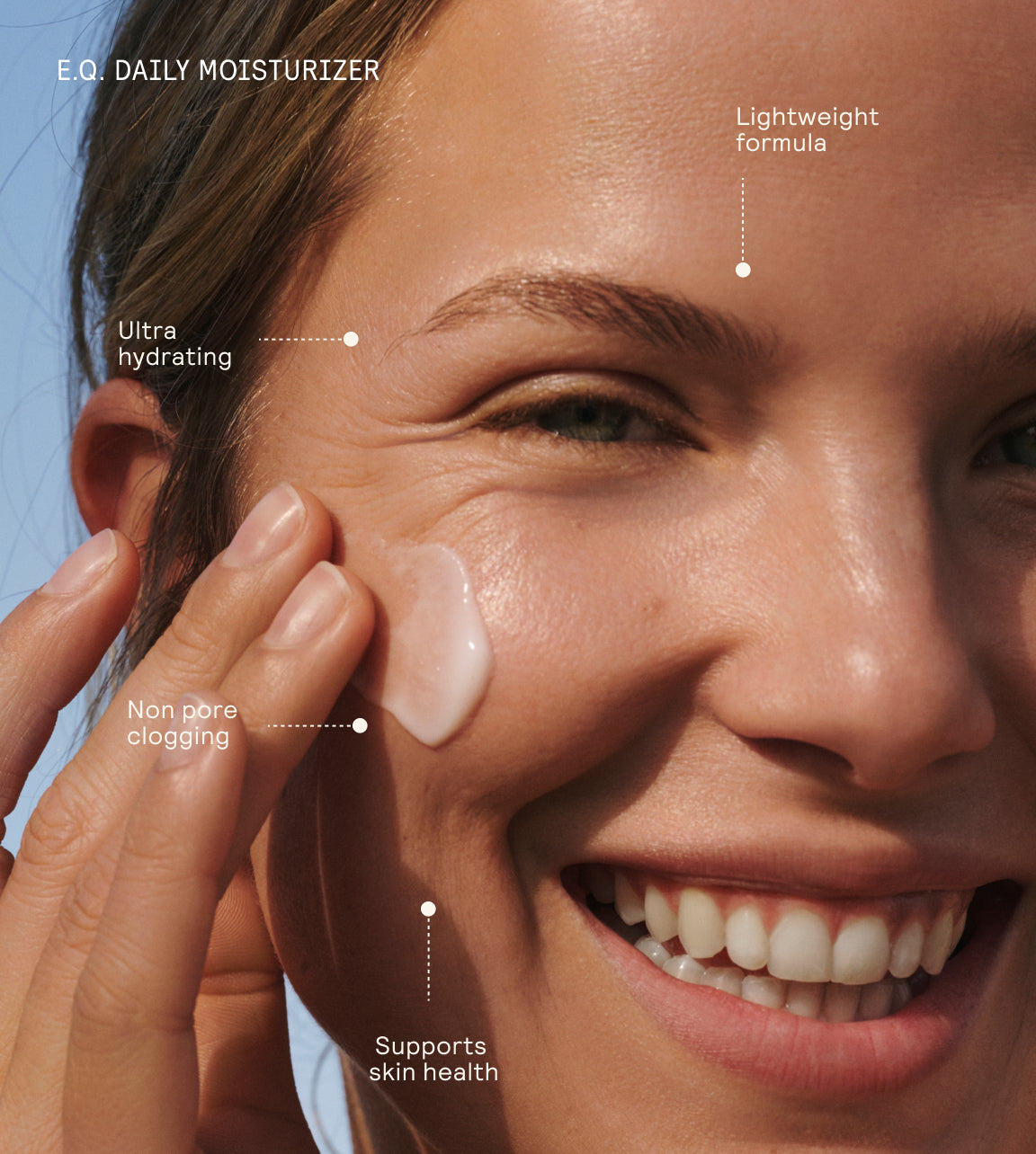 Apply two to four pumps of the EQ Daily Moisturizer onto fingers, and delicately press into the face and neck.